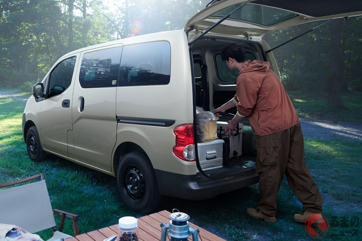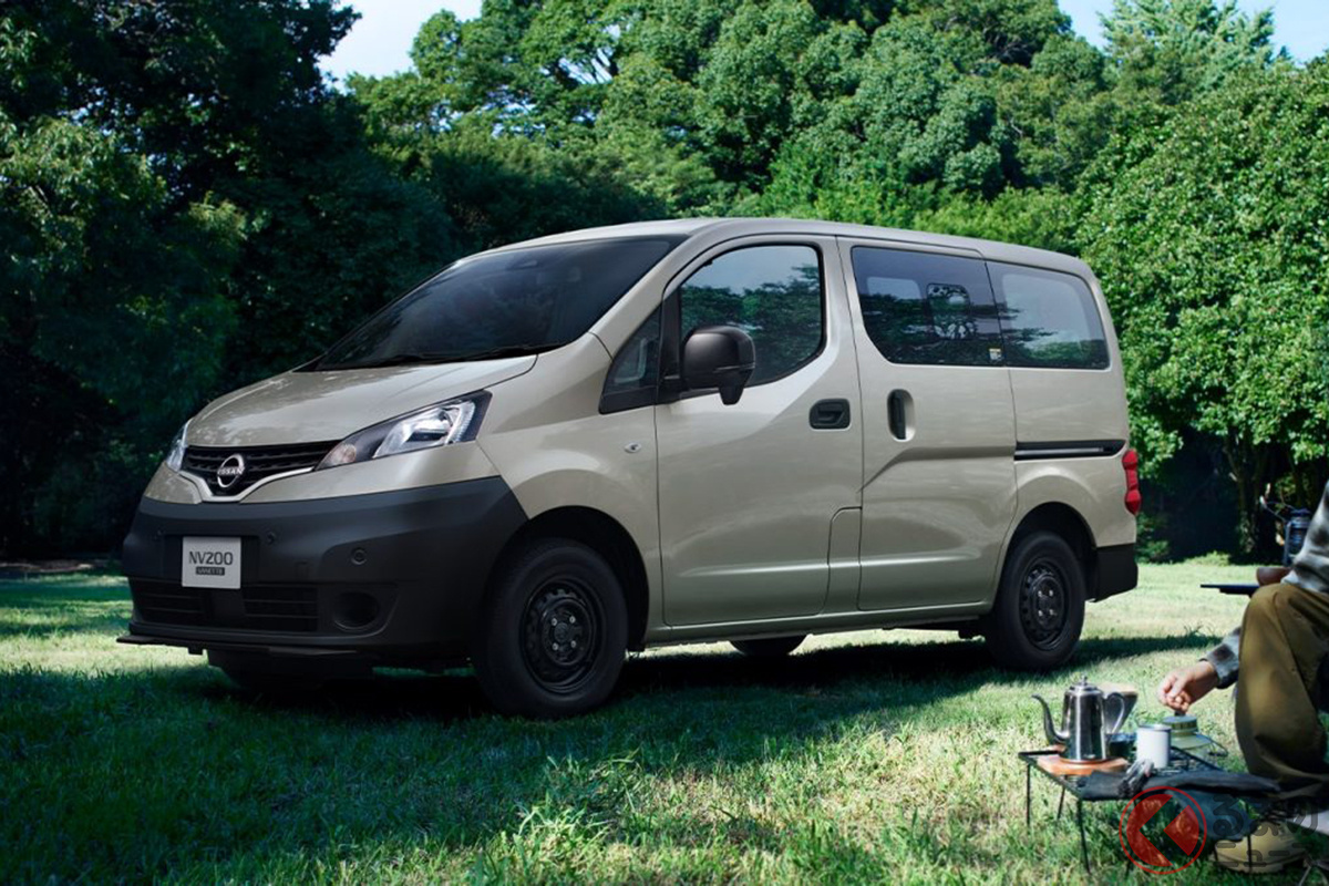 約270万円! 日産の「新“3列・7人乗り”コンパクトミニバン」がスゴい! 全長4.4m級で「セレナより小さい」“スライドドア”モデル! 精悍「黒マスク」の“アウトドア”仕様もカッコいい「NV200バネットワゴン」に注目