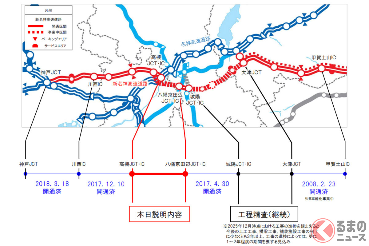 NEXCO西日本は新名神高速のうち、八幡京田辺JCT~高槻JCT間で進めている工事の進捗を発表しました。2027年度の開通は困難だとする見通しを明らかにしています。