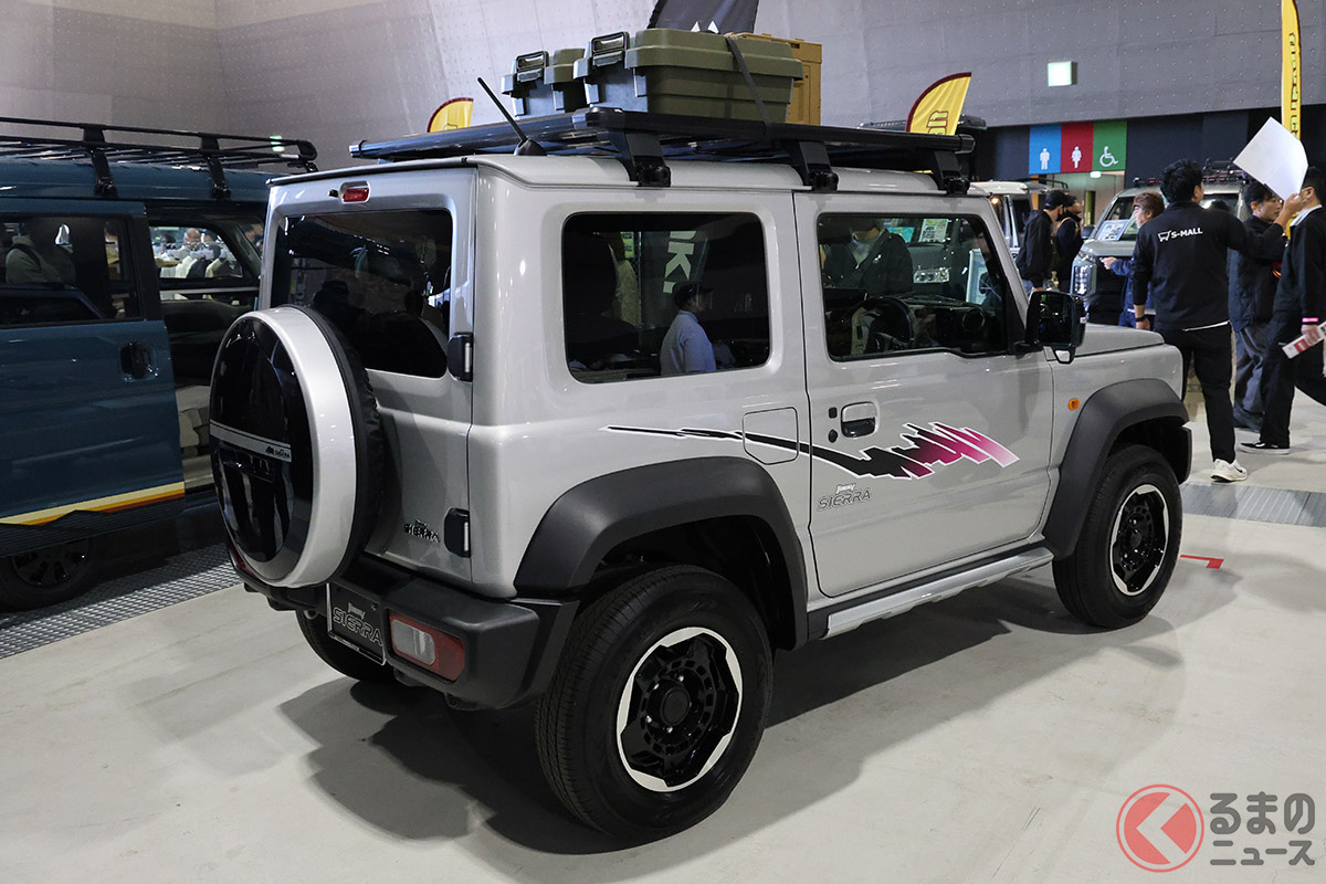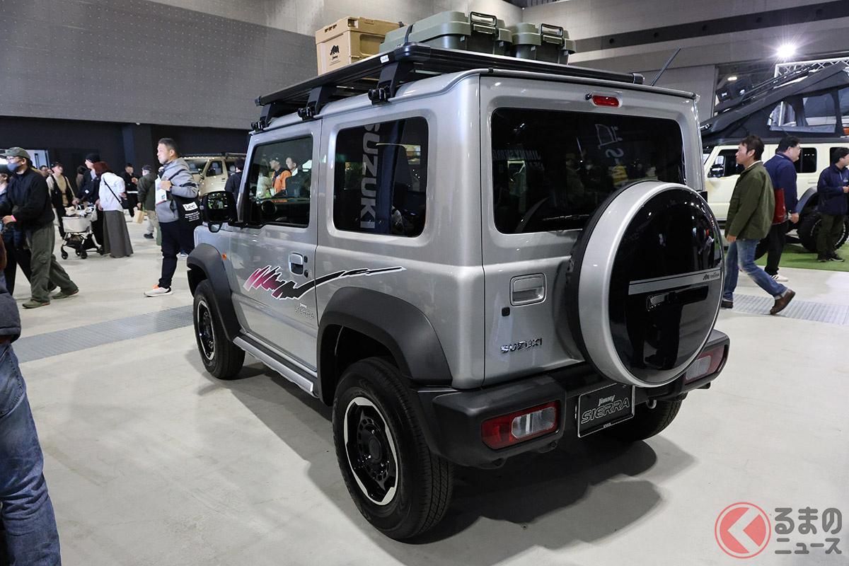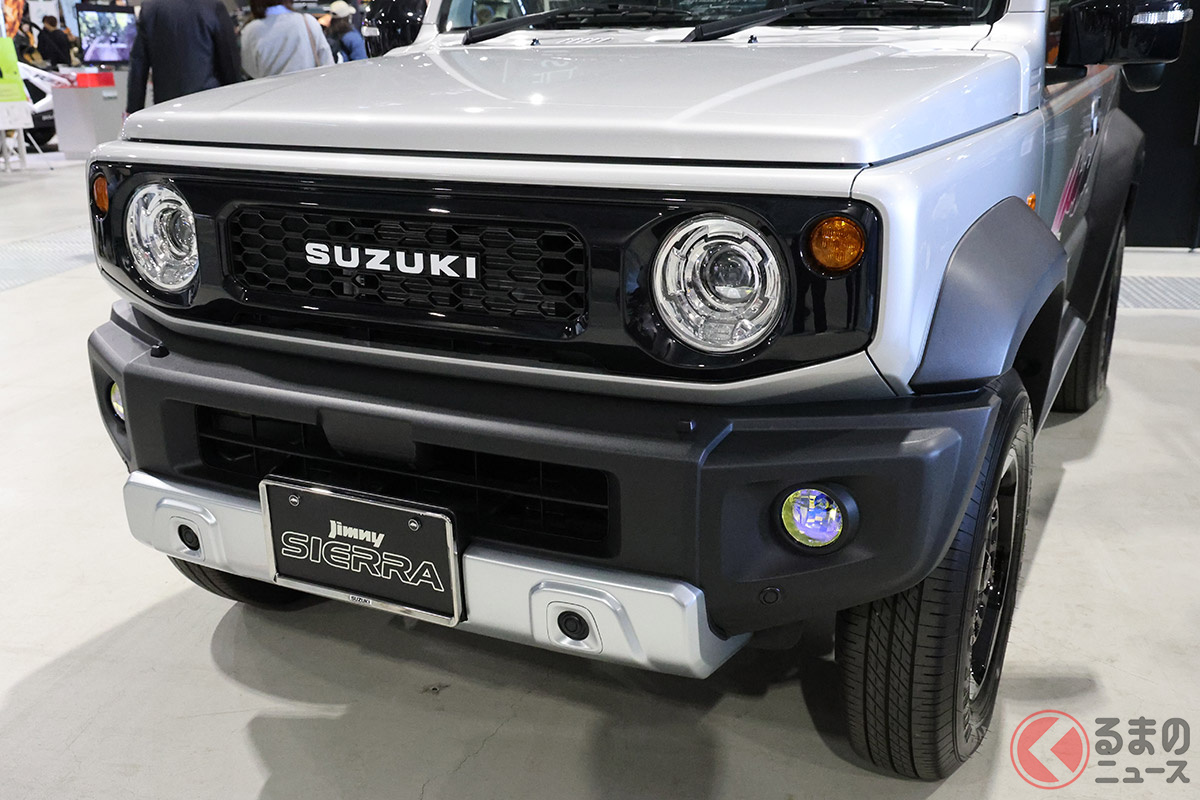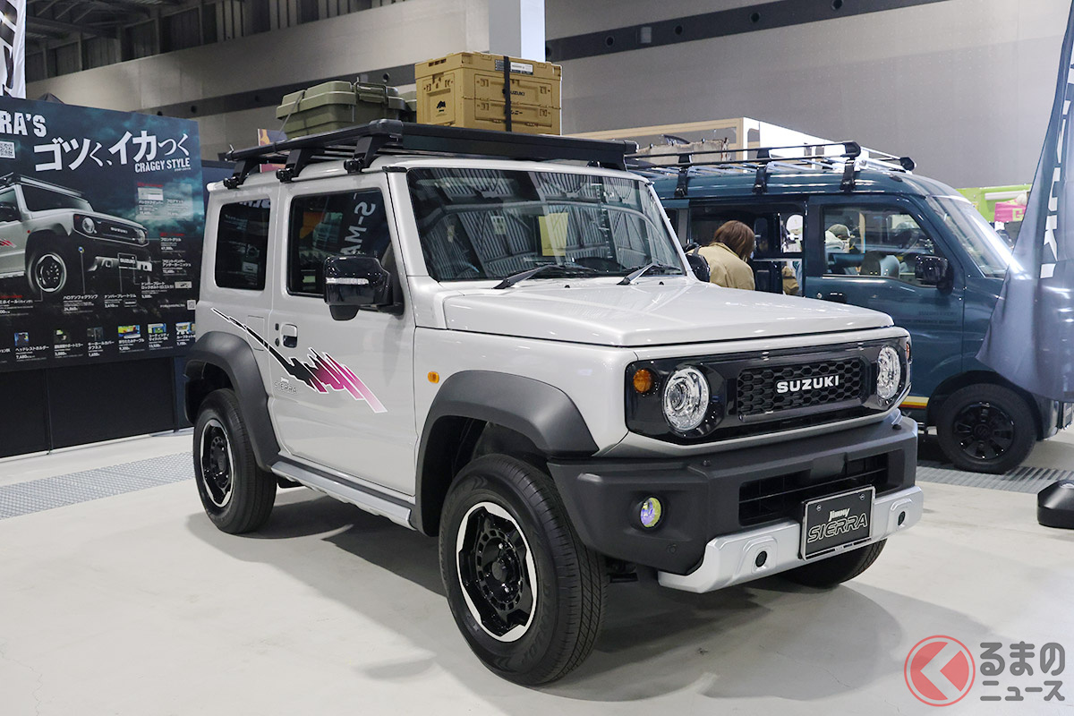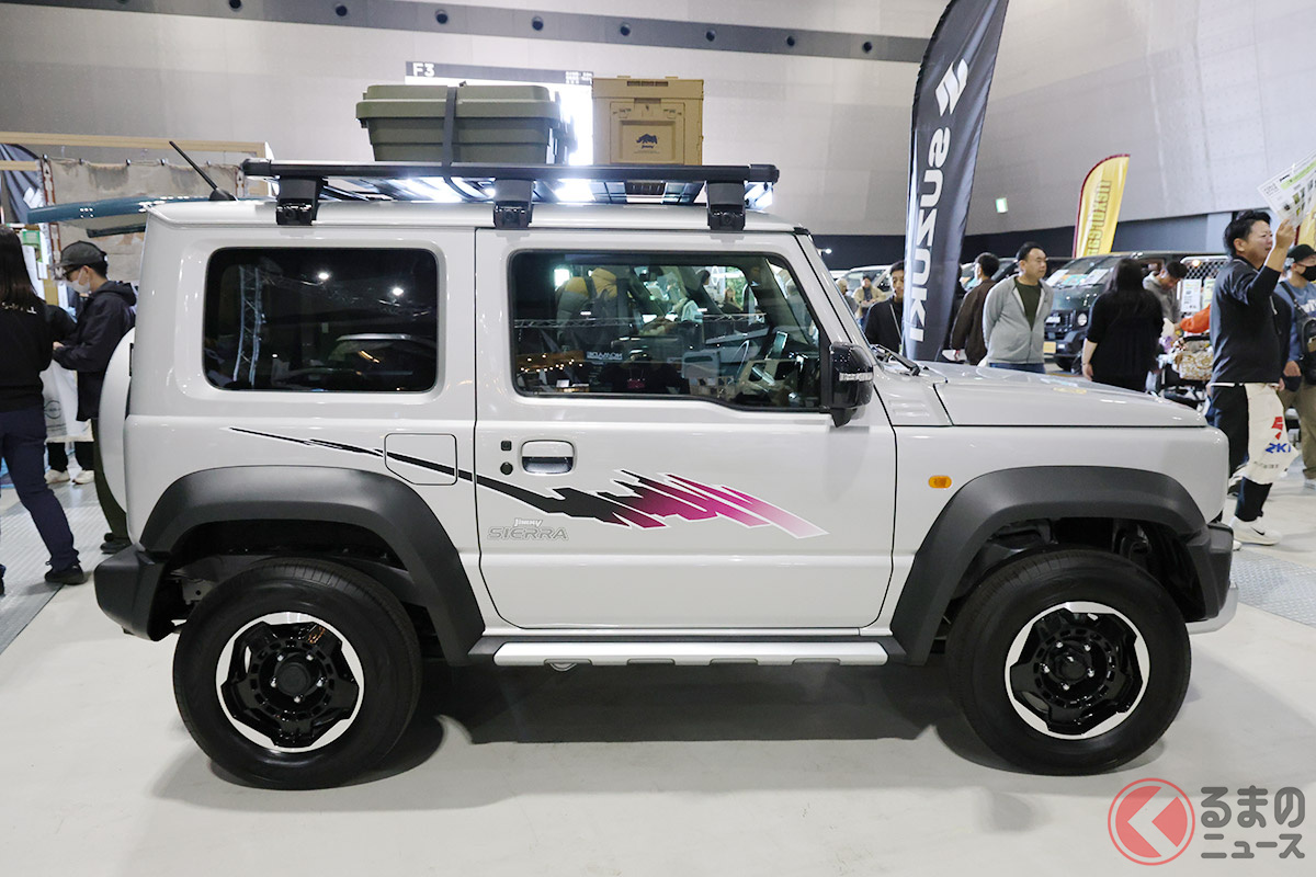 スズキ「“新”ジムニーシエラ」実車展示! カクカクボディ×「SUZUKI」ロゴが鎮座する“ブラック顔”がカッコいい! 懐かしのデカールでレトロ感マシマシな「カスタム仕様」とは!