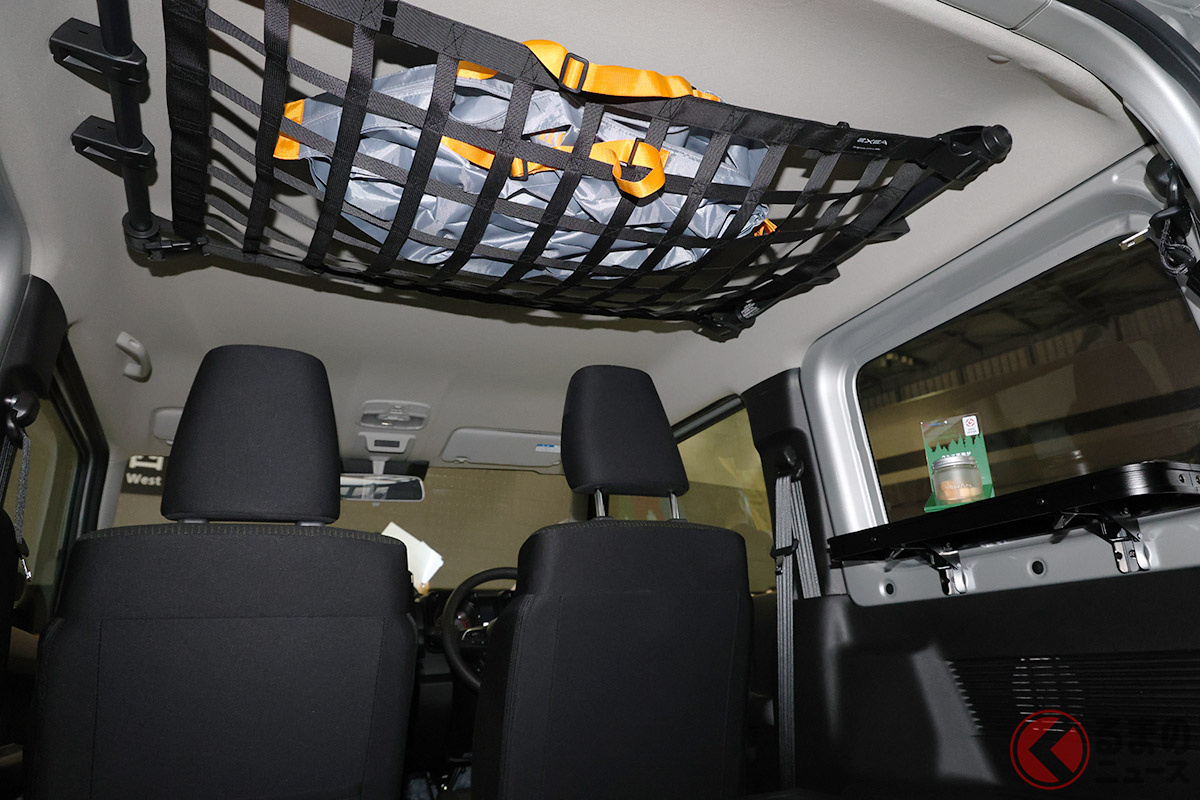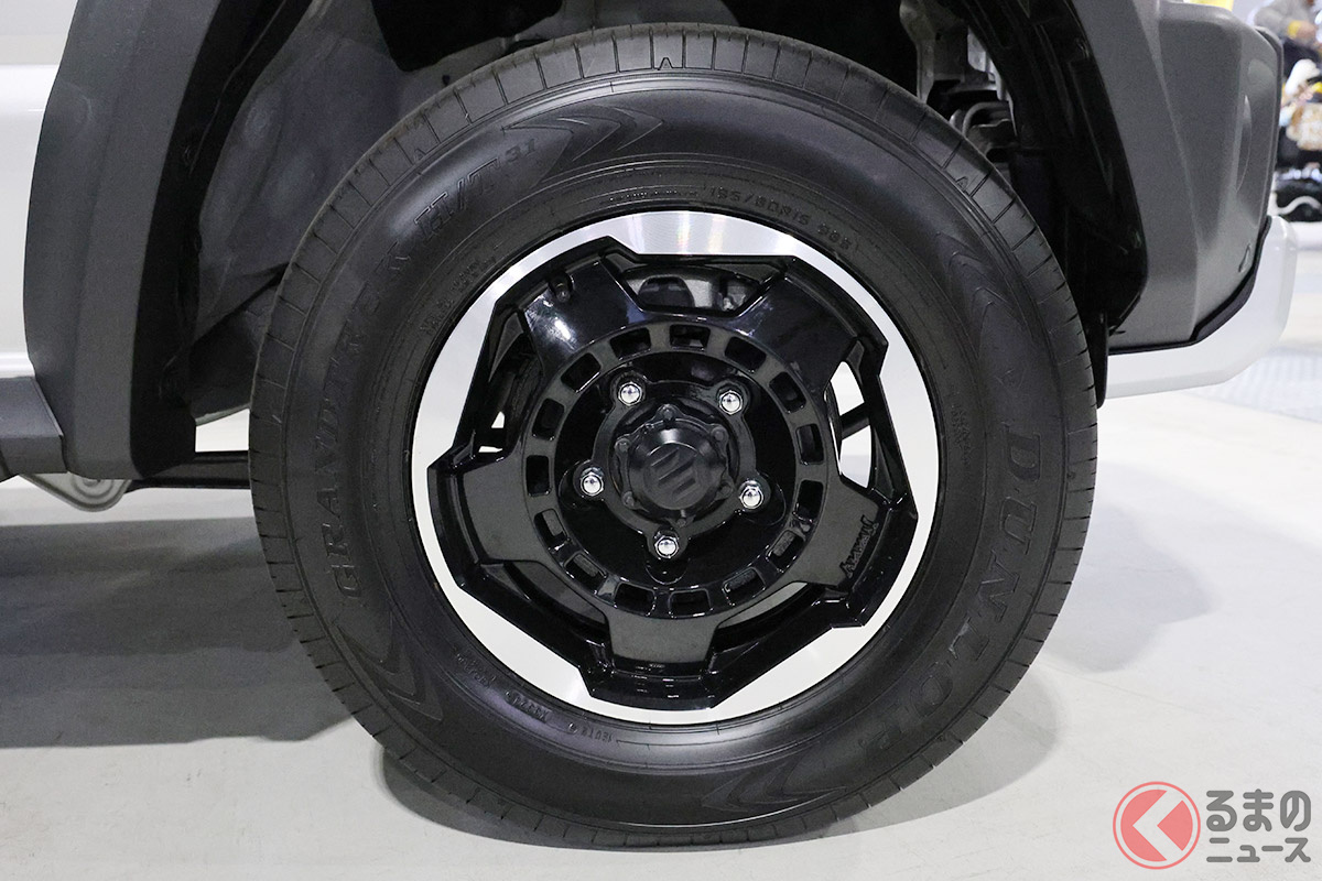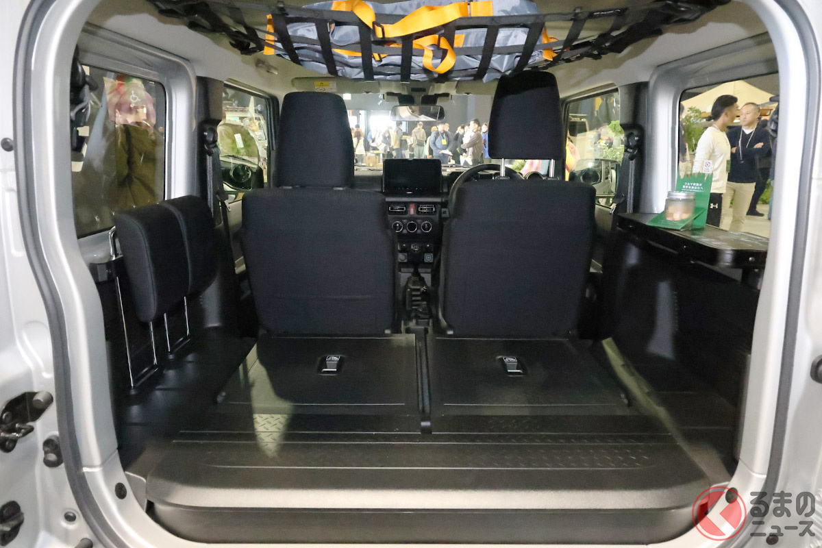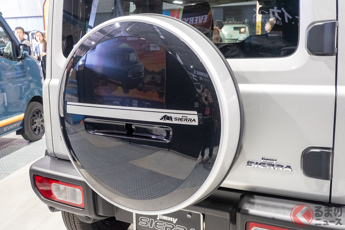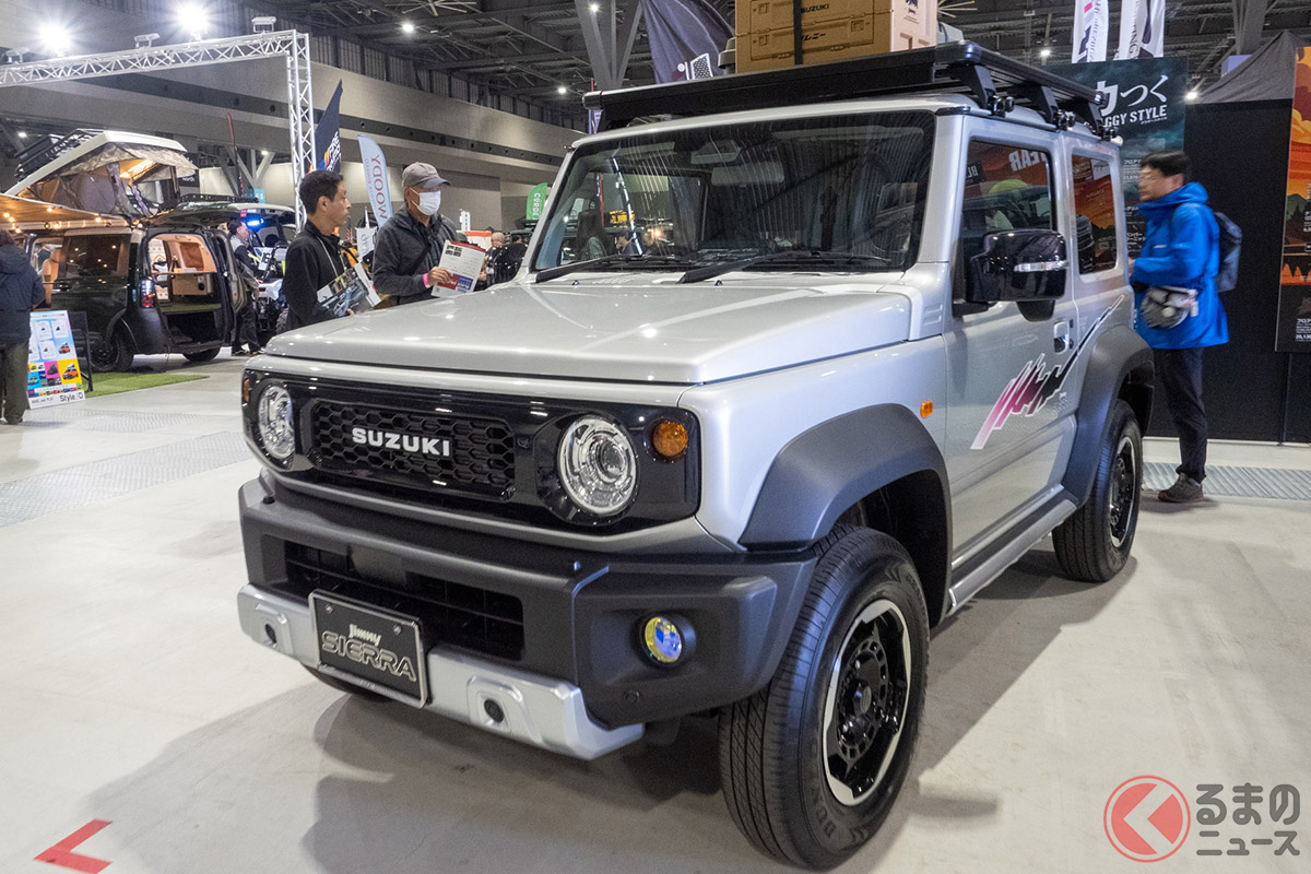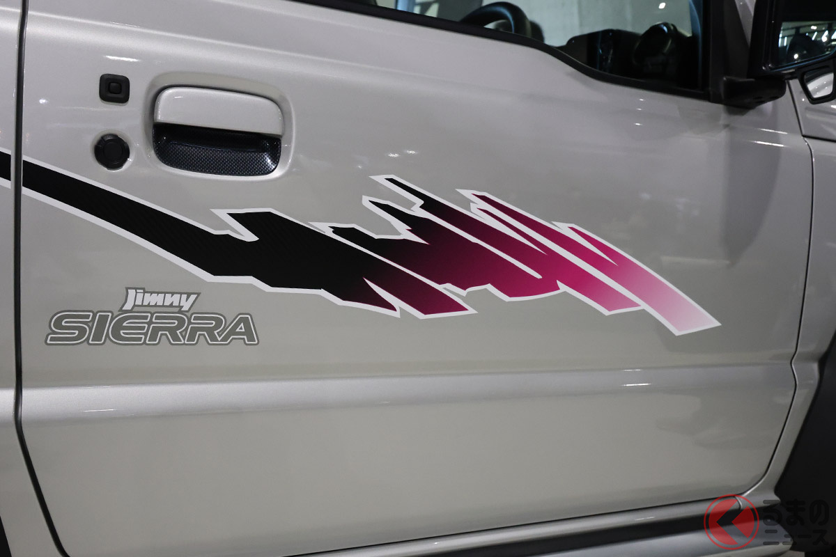 スズキ「“新”ジムニーシエラ」実車展示! カクカクボディ×「SUZUKI」ロゴが鎮座する“ブラック顔”がカッコいい! 懐かしのデカールでレトロ感マシマシな「カスタム仕様」とは!