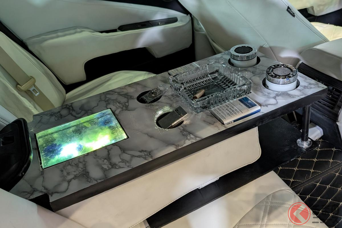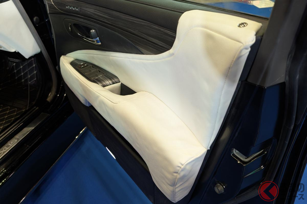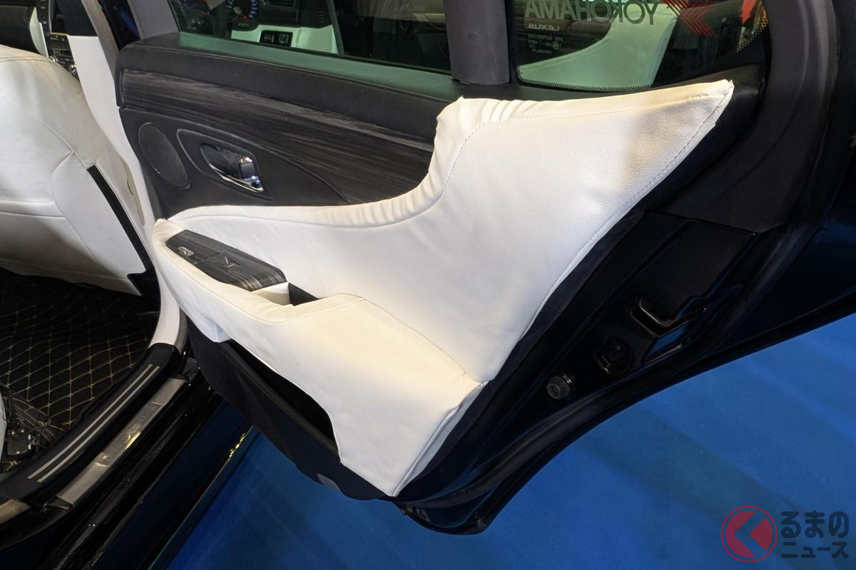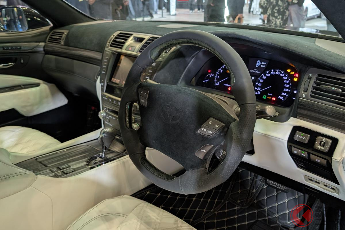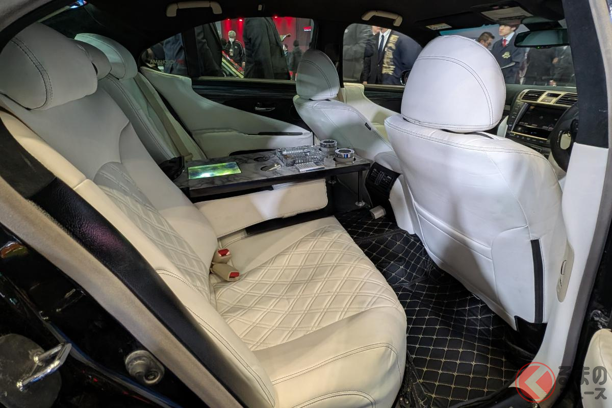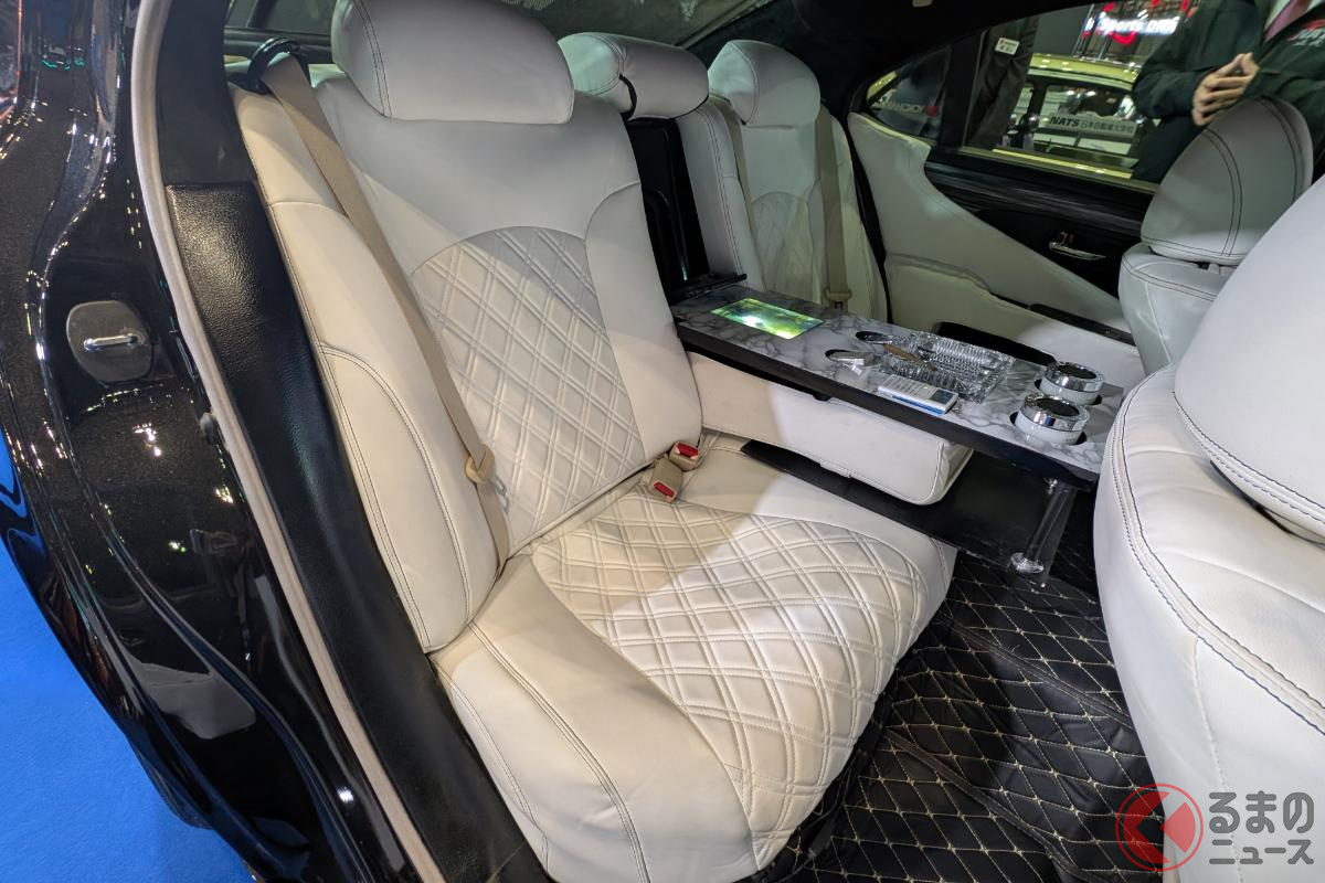 斬新「ヴェルファイア セダン」初公開! “全長5m超え”ボディ&「ド迫力顔」採用! 「豪華な白内装」に“光るVIPな仕掛け”も! 「V8エンジン×FR」で高級感漂うレクサスLSベースのNATS「大型セダン」登場!