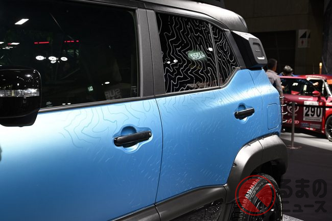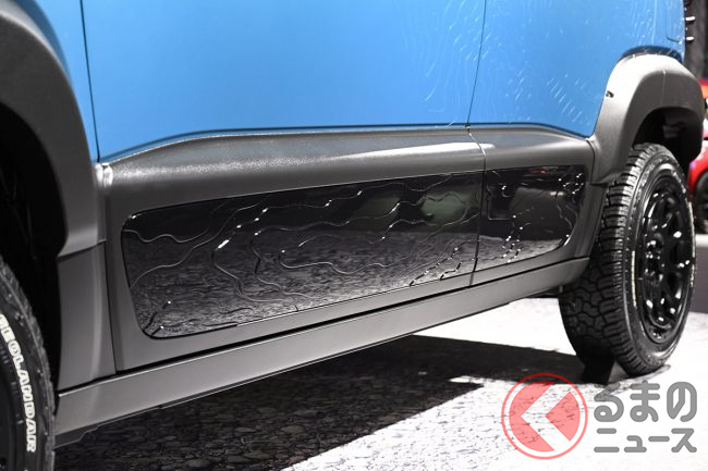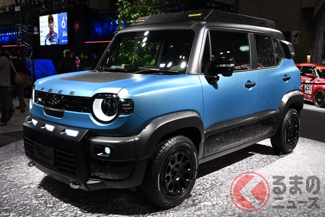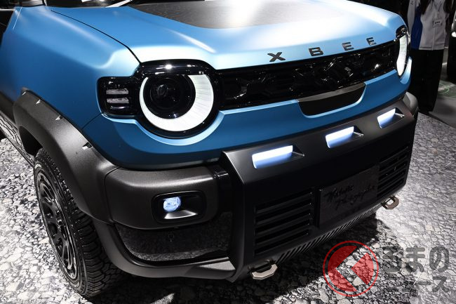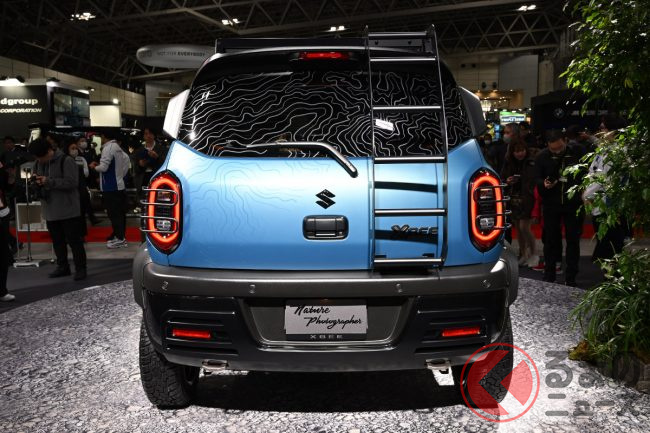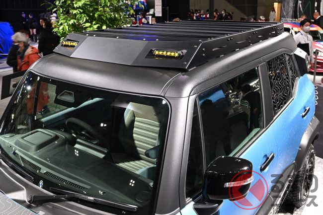 スズキ「すごい小型SUV」初公開! 光るバンパー&ルーフラックדゴツゴツ”オーバーフェンダー装着のタフ仕様! ハシゴで“屋根に上れる”斬新「クロスビー」とは!