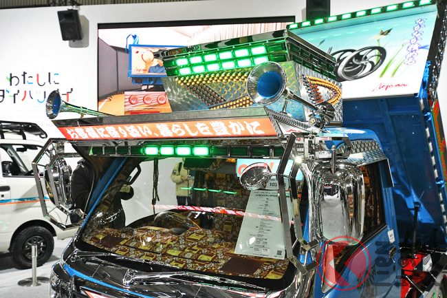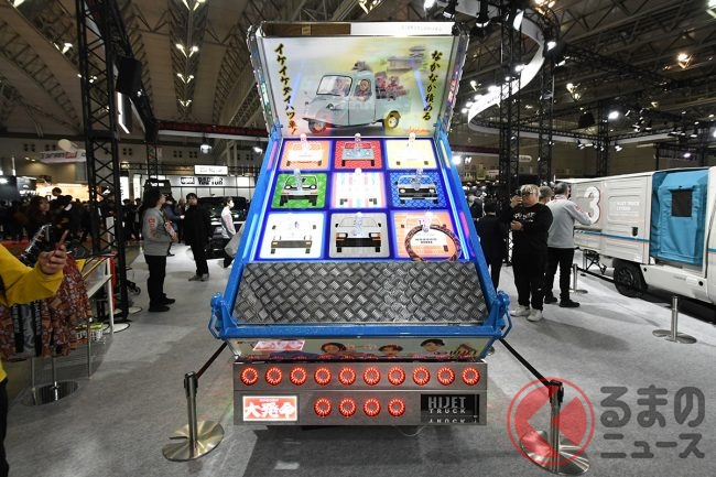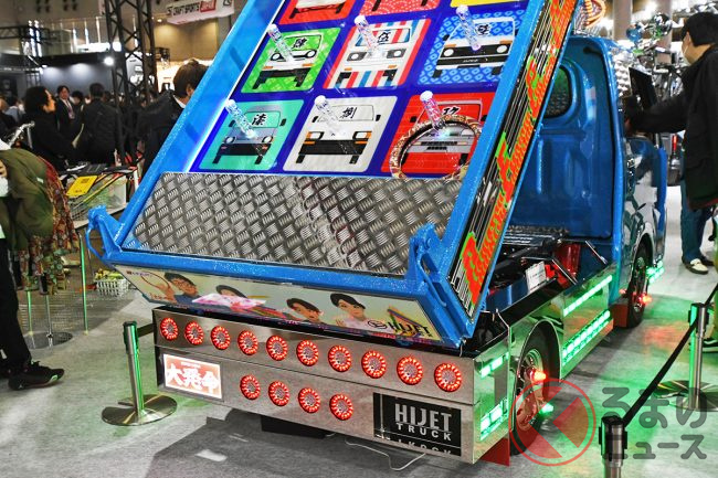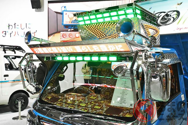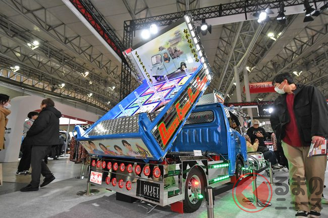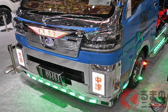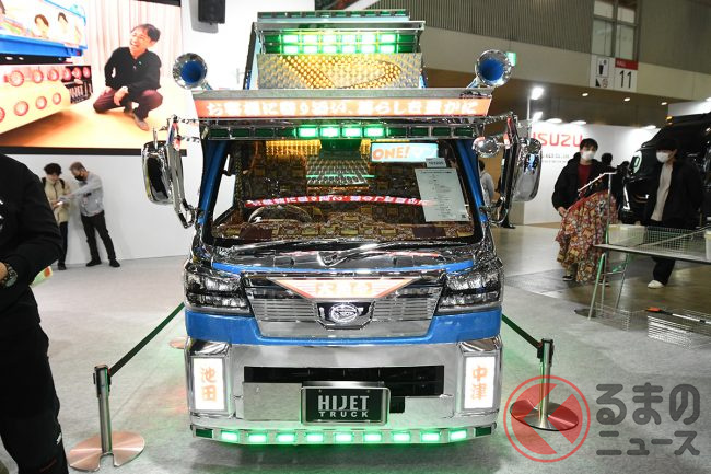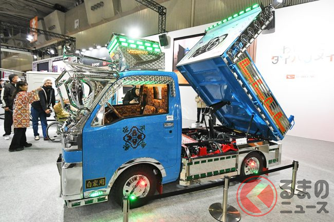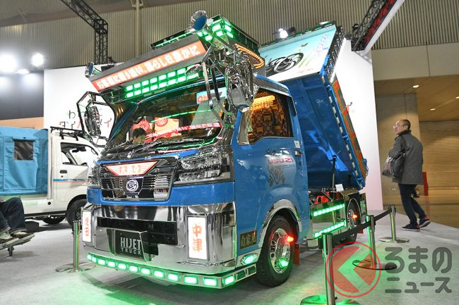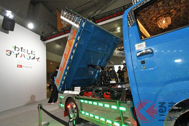 ダイハツはカスタムカーの祭典「東京オートサロン2026」に異彩を放つ「ギンギラギン」な軽ダンプを出展し、「デコトラのようだ」と大いに話題を集めています。“令和のデコトラ”「ハイゼットトラック PTOダンプ 大発命(ダイハツメイ)」について紹介します。