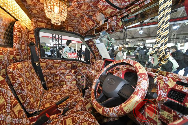 オリジナルのフロントバイザーでは、「お客様に寄り添い、暮らしを豊かに」というメッセージをストレートに発信。その上部のシートデッキキャリアでは、ビッグサイズの“光るダイハツロゴ”が輝いています。