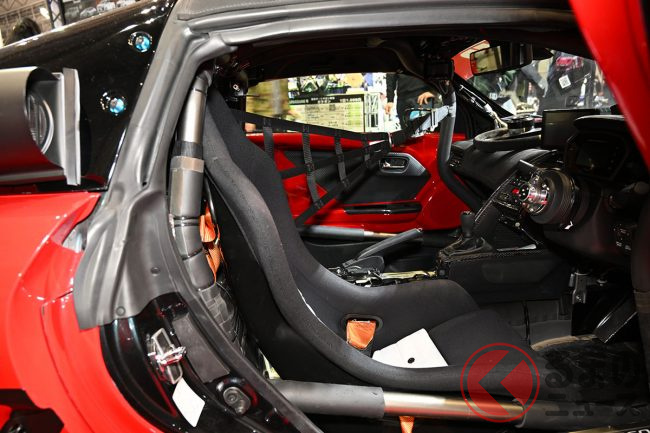 そして今回は、ドアにゼッケンも残る参戦時の姿で展示。さらにドアはシザース式に変更、きらびやかに点滅する灯火類に変更した「ショースタイル」にドレスアップされていました。