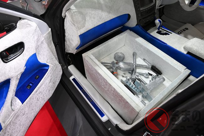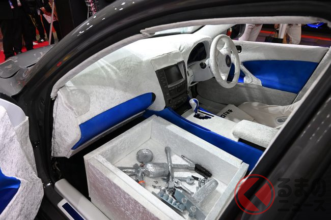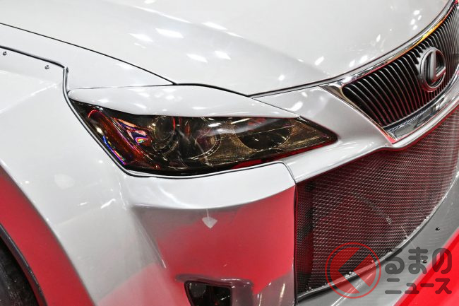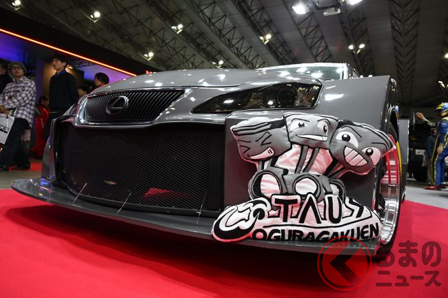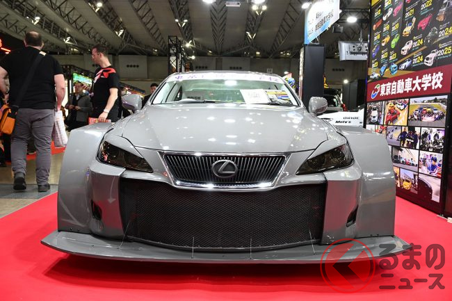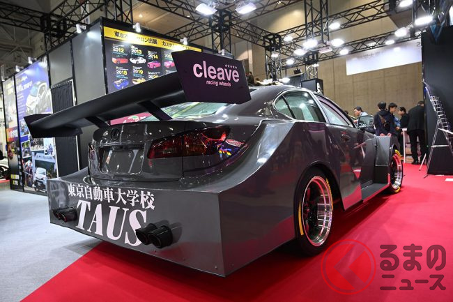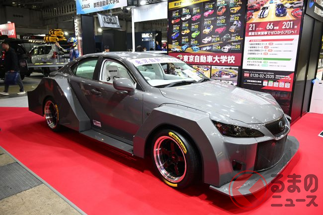 レクサス斬新「“超カクカク”セダン」が凄い! “昭和マシン”風「ワイドボディ」装着&「1人乗り豪華内装」採用! レクサスISベースの東京自動車大学校カスタムカー「TAUS-HFRS」 TASで披露