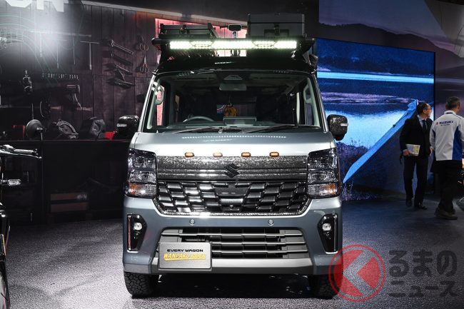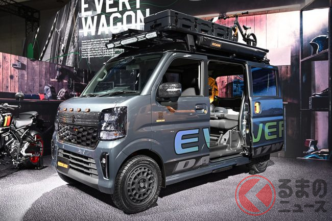 スズキ「“凄い”エブリイワゴン」初公開! 斬新“黒い大型グリル”&オフロードタイヤ装着でタフ感マシマシ! 市販化熱望の“軽商用車カスタム”「ワンパクライダー」とは!