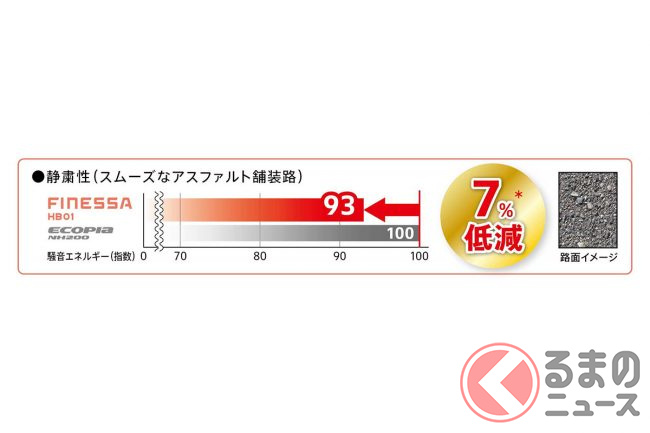 さらに、新パタンに搭載される「スリットサイレンサー」によって、走行中のノイズを気になりにくい音質へチューニングし、これにより、スムーズなアスファルト舗装路でのパタンノイズを「ECOPIA NH200」対比で7%低減。再生資源を原材料の一部に使うなど、「サステナビリティへの貢献」も意識した製品になっているとのことです。