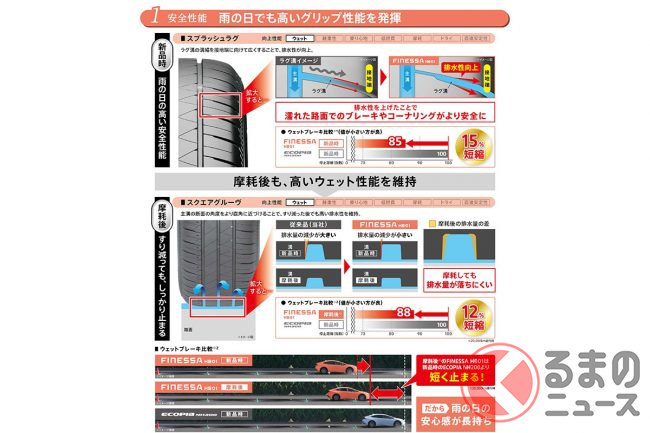 中でもウエット性能に関して、新パタンのショルダー部に採用される「スプラッシュラグ」で主溝からの排水性を向上。主溝には「スクエアグルーヴ」を適用することで摩耗しても溝体積の変化をより小さく抑え、高い排水性を維持します。これにより、同社の「ECOPIA NH200」対比ウエットブレーキ制動距離を15%短縮しています。