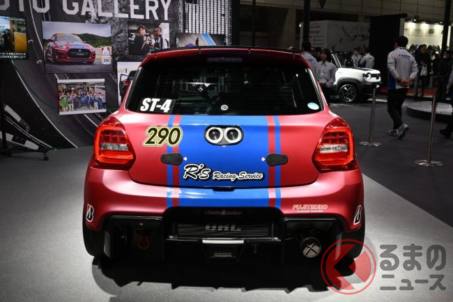その自動車メーカーの1つであるスズキは、様々な提案モデルと共にスーパー耐久シリーズのST-4クラスに参戦するスイフト・スポーツ(以下:スイスポ)を参考展示しました。