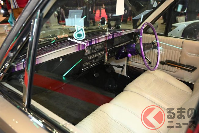 内装にも手は抜かれていません。「一番はダッシュボードとリアのスピーカーボードを作り直してカスタムペイントしてありますね」と語り、さらに「天井とかも全部布が黄ばんでいたんで張り替えたり、カーペットも新しく作ったりしています」と続けます。