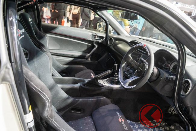 東京オートサロン2026の会場で実際に展示された個体は足元を18インチのRSワタナベ エイトスポークRタイプで着飾り、内装はResult Japanオリジナルのフルバケットシートとステアリング、そしてクスコ製ロールケージで仕上げた一台となっています。