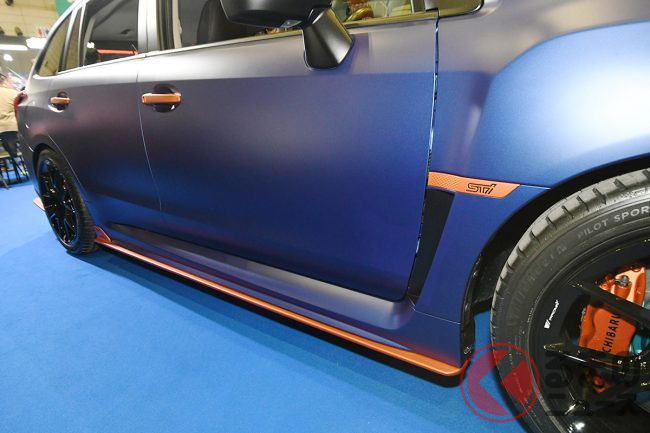 マットブルーのボディにオレンジのSTIエアロやミラーが映えるこのレヴォーグは、一見ラッピングのようにも見えますが、実は車体を一度バラバラに分解して全塗装を施したこだわりの一台です。