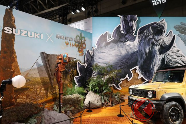 ブース内には、ゲーム内に実際に登場する武器「ハンマー」の精巧なオブジェや、同じくモンスターハンターとのコラボレーションによって生まれたコラボ車両の「ジムニーノマド」も展示されていました。