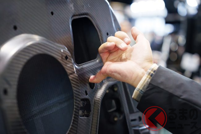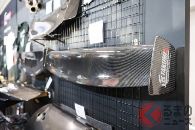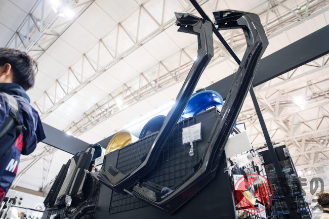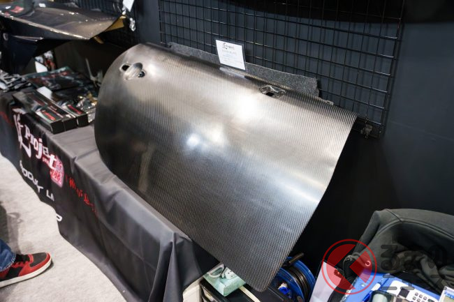 近藤エンジニアリングは、カーボンパーツ類にも力を入れています。会場には新発売のGR86/BRZ用カーボントランクやドライカーボンドアが展示され、実際に持って軽さを体感できるようになっていました。