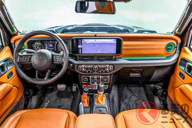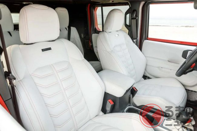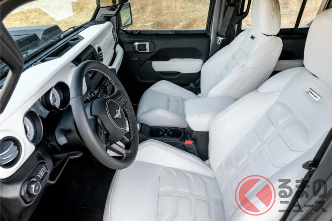 コックピットは基本的にラングラーと同じですが、シートは専用設計で、多彩なカラーや素材を用意。オーナーの好みに応じたカスタマイズが可能です。
