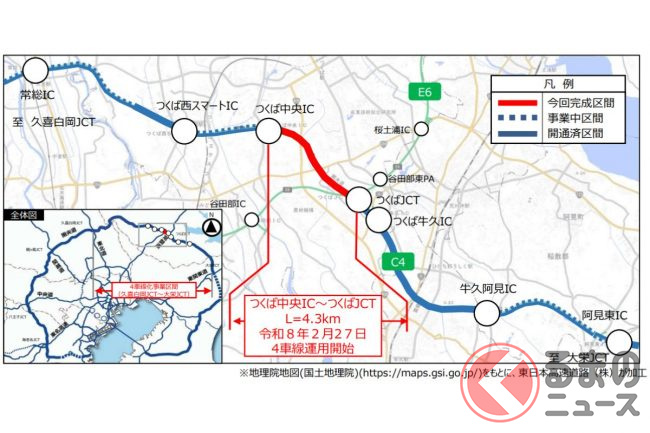 NEXCO東日本は2026年1月16日、圏央道のつくば中央IC〜つくばJCT間の4.3kmが4車線化されると発表しました。