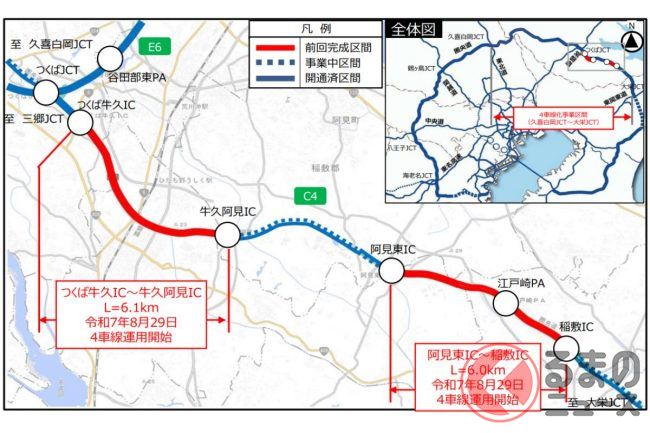 なお、つくばJCTから大栄JCT方面については、2025年8月に牛久阿見ICまでが4車線化を実施。その先も、阿見東IC〜稲敷ICまでがすでに4車線化されています。