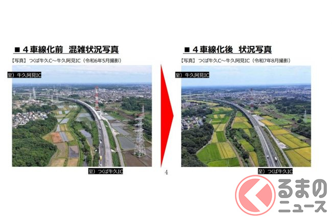 このうち、つくば市内へのアクセスを担うつくば中央ICから、常磐道と接続するつくばJCTまでの4.3kmが4車線化され、休日には激しい混雑となるつくばJCT付近の渋滞緩和が期待されます。