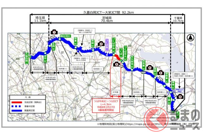 NEXCO東日本は圏央道のつくば中央IC〜つくばJCT間が2026年2月27日の6時から4車線化されると発表しました。