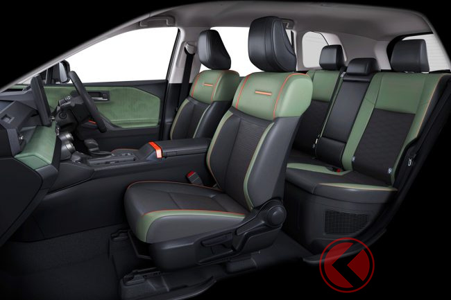 Adventureモデルのボディサイズは、全長4620mm×全幅1880mm×全高1680mmで、ノーズピークを高く設定したフロントや大型アーチモールなどで力強くてタフな印象を強調。インテリアには低彩度グリーンとオレンジを組み合わせた専用カラー「ミネラル」やカモフラージュ柄を採用することで、アウトドアな世界観を演出しています。