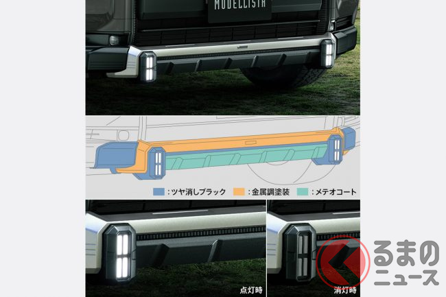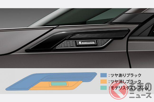 「フェンダーガーニッシュ」(3万3000円)は、フロント両サイドのフェンダー上部に設置するオプションパーツで、ツヤあり・ツヤ消しのブラックを組み合わせつつ、「MODELLISTA」の英字ロゴを使ったエンブレムが取り付けられます。