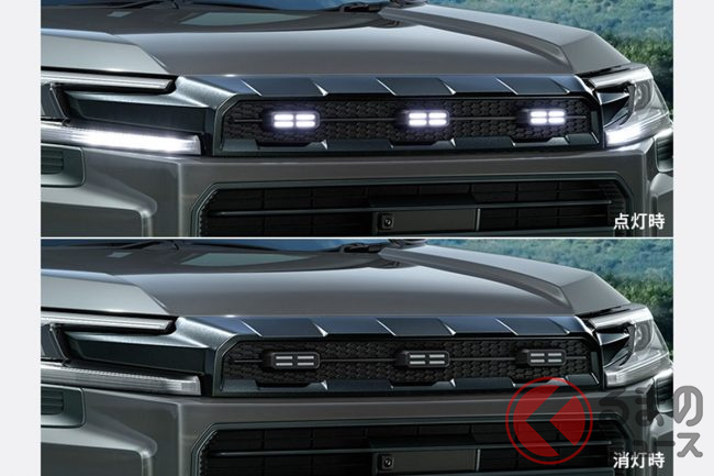 「フロントグリルイルミネーション」(11万5500円)は、フロントグリル上にLEDライトを追加するオプションで、4つのLEDが一体になったユニットを等間隔に3つ並べるデザインとなっています。