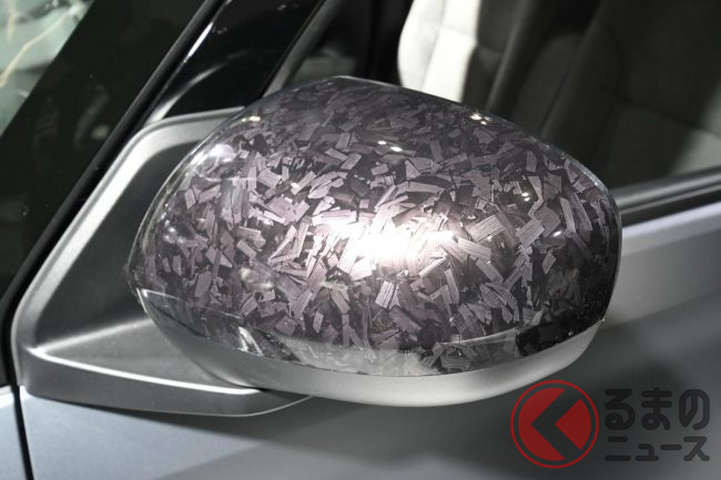 また、ミラー上部やリヤガーニッシュ、リヤスポイラーにはフォージドカーボンのカッティングシートがラッピングされています。幾何学模様のカーボンではなく、短い炭素繊維がランダムに入っているのが、フォージドカーボンの特徴です。