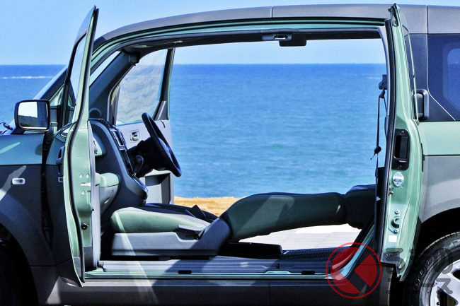 スクエアな形状と大面積の無塗装樹脂クラッディングパネルを多用したタフなスタイリングが目を引きますが、コンセプトカーで最大の特徴だったBピラーレスの観音開き構造もそのまま採用されました。