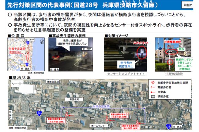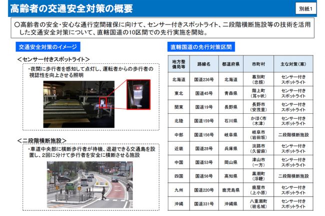 国土交通省は2026年1月20日、高齢者の歩行中事故を防ぐため、センサー付きスポットライトなどの新たな交通安全対策を直轄国道で開始すると発表しました。