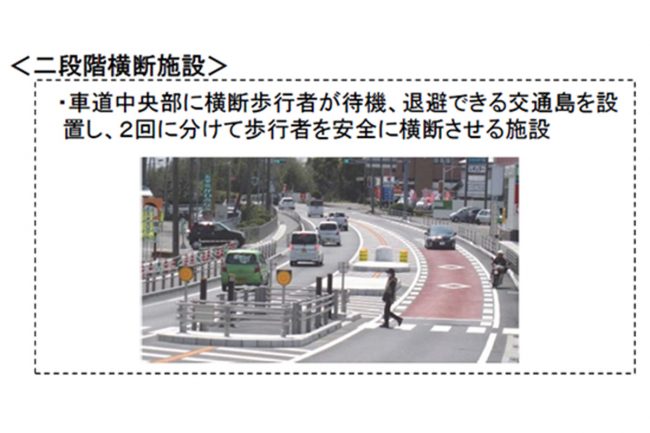 幅の広い道路などを一度に渡り切るのではなく、2回に分けて安全に横断できるようにします。