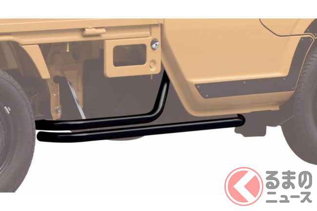 そのほか、ベースキャリアに組み合わせて装着し、工具、ロープ等を積載しやすくする「キャリアユーティリティパネル」(2万40円)、ベースキャリアに組み合わせて装着する専用追加バー「ベースキャリア専用追加バー 2本セット」(9900円)、ステップとしての強度も兼ね備えたランニングパイプ「ランニングパイプ」(6万9300円)、足元を引き締めて泥跳ねからボディを守るアルミプレート付き泥除け「マッドフラップ」(各1万7800円)、キャリアのパイプに巻き付けて積載物を保護する専用設計パッド「角パイプ用パッド」(各2200円)などもラインナップしています。