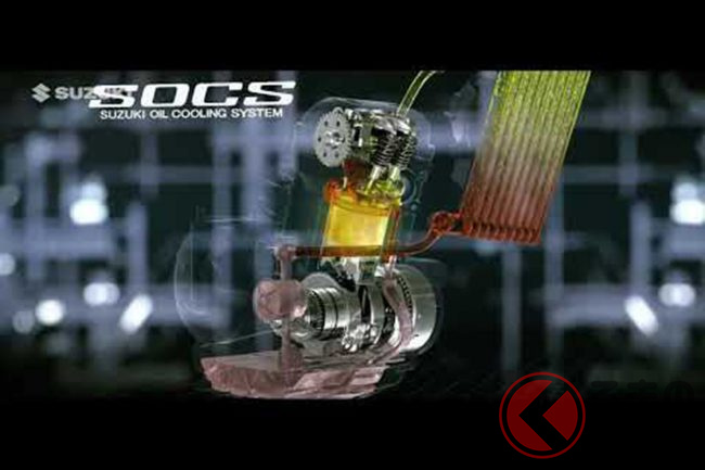 SOCSは、エンジンの燃焼室周辺にオイルジャケットという冷却回路を設け、オイルクーラーで冷却したオイルを高速で循環させてエンジンを冷やすシステムです。この回路は潤滑系統から独立しており、オイルジャケット内には「バウンダリーレイヤーブレーカー」と呼ばれる突起を設けることでオイルの流れに変化を生じさせ、冷却効率をさらに高めています。オイルクーラーはサイズが最適化され、渋滞時など走行風が得られない状況を想定した電動冷却ファンも装備されています。