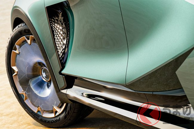ホイールは編み込み風のメッシュデザインで、力強い走りを想起させる造形。「ラグジュアリーな乗り心地を表現したLSコンセプトとは対照的に、走りの印象を強く打ち出しています」と担当者は説明します。