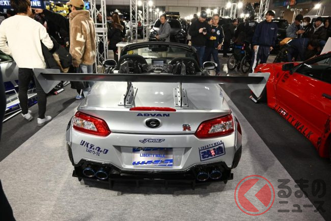 日産「“ちいさい”GT-R」!? コンパクトすぎる“軽ボディ”の「660ccモデル」公開! 大型リアウイング&4本出しのマフラー採用のリバティーウォーク コペン GT-K タイプ2とは