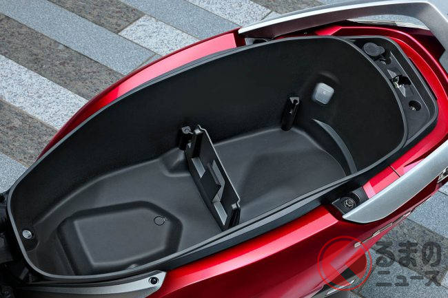 このモデルの大きな特徴は、日常の利便性を高める豊富な装備にあります。シート下には37Lという大容量のラゲッジボックスが確保されており、内部にはLED照明も設置されています。