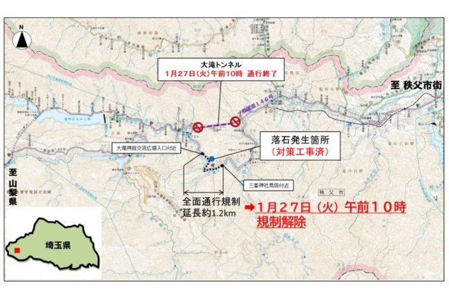 埼玉県は2026年1月20日、国道140号のうち、秩父市内の一部区間で実施していた落石による通行止めの解除を発表しました。1月27日午前10時に解除されます。