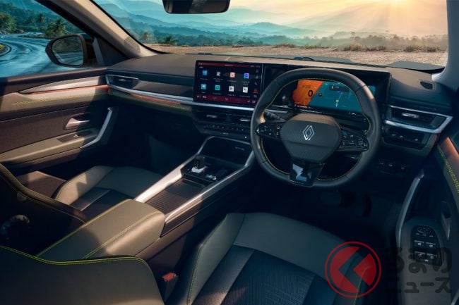 パワートレインについても、インド向けのルノー車として初となる「E-Tech 160(フルハイブリッド)」が導入されます。これは1.8リッター直列4気筒エンジンに2つの電気モーター、1.4kWhのバッテリーを組み合わせたシステムで、システム最高出力160馬力を発揮します。市街地走行の最大80%を電気のみで走行できる効率性を備えています。