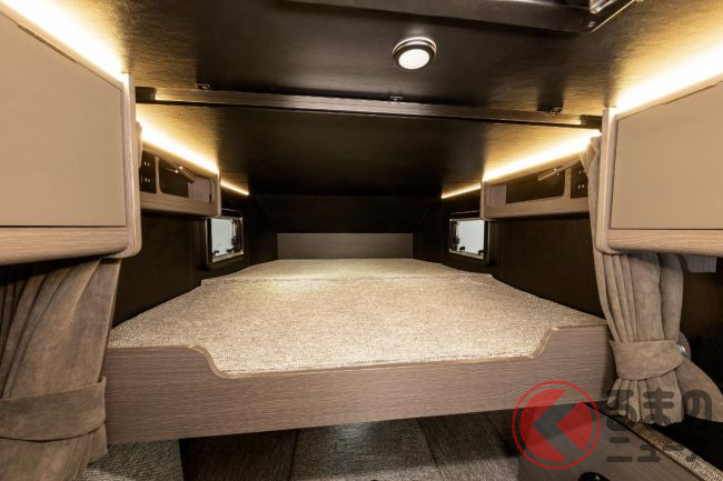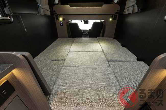 ソファを展開することでフルフラットベッドに早変わりするほか、運転席上部には引き出し式のバンクベッドも備えており、少人数での旅なら就寝スペースに困ることはありません。