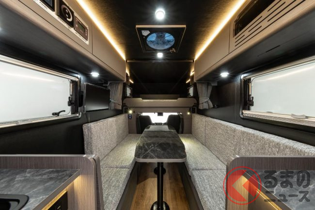 インテリアにおける最大の特徴は、このクラスのキャブコンとしては珍しい「コの字型ソファレイアウト」の採用です。