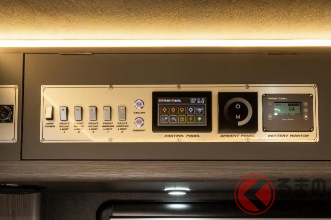 これらを制御するためのスイッチ類は「オリジナルコントロールパネル」に集約されており、照明や空調、バッテリー残量の確認などを手元で直感的に操作することが可能です。