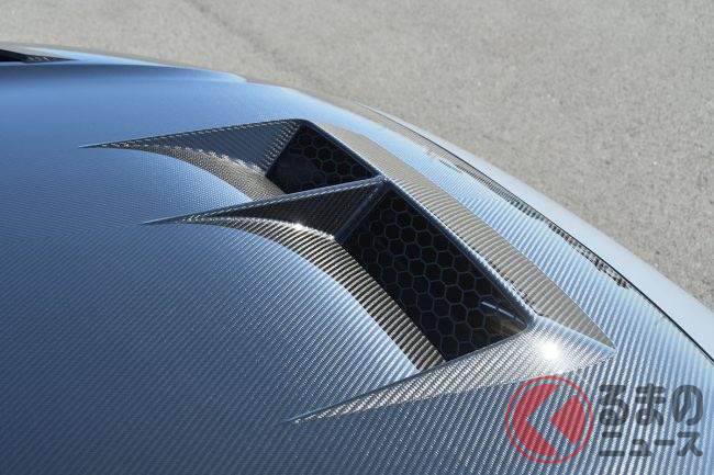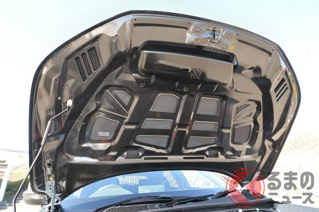 いずれも徹底した空力性能と軽量化を追求したもので、さらに排熱効率のアップなどに加え、フェンダーとボンネットのパーツはカーボン素材の柄と大型ダクトがレーシーな雰囲気を付与することに一役買っています。