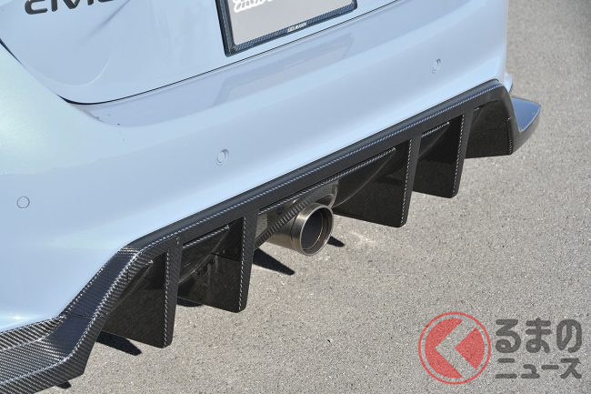 レーシングマシンのようなディフューザー形状は、空力解析をして開発したもので、滞留する空気を放出し、空気抵抗を低減。これにリアの2つのスポイラーとウイングを組み合わせることで、強大なダウンフォースを獲得できます。