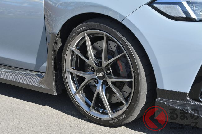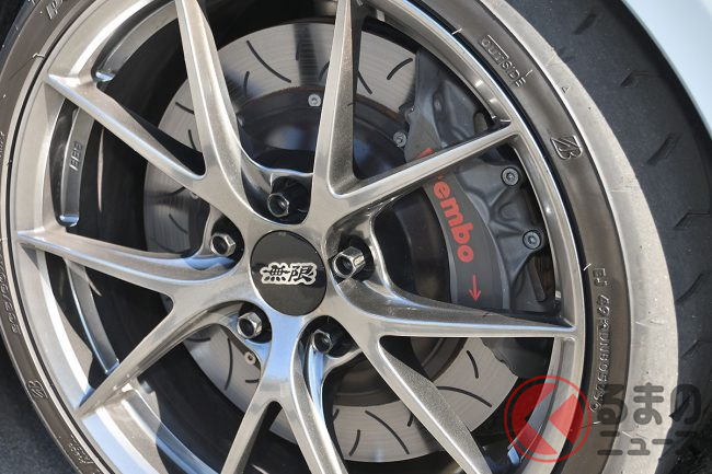 スリット入りの大径ローターと、ホイール目一杯のキャリパー容量から性能を物語る「ハイパフォーマンスブレーキシステム」(110万円)は、国際サーキットでの使用を想定したもので、900度近い温度での走行テストを繰り返し行い開発。ブレーキタッチの剛性感向上と高い制動力を実現したといいます。