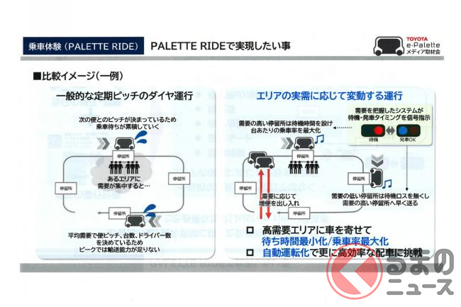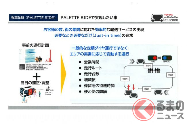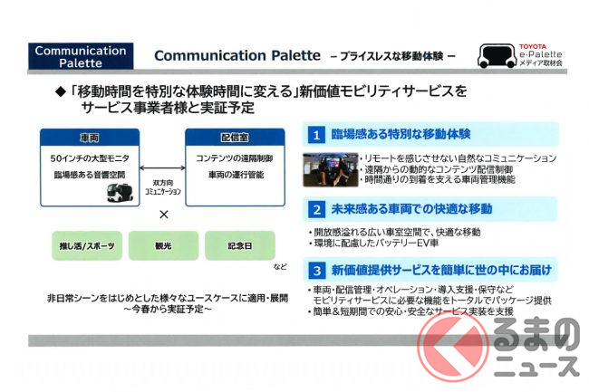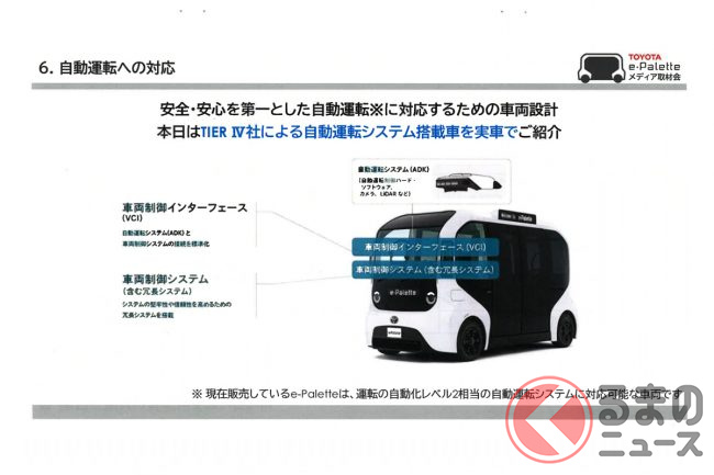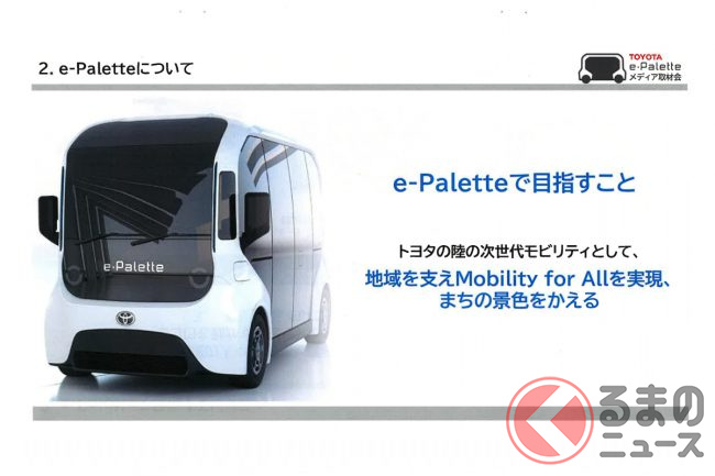 その名称の由来について、e-Paletteの事業を統括するトヨタ自動車 エアロ・モビリティ事業部の松本洋二郎氏は「絵の具のパレットのように、このモビリティで自由な未来を描きたいという思いで付けた」と語っています。