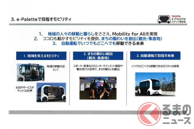 e-Paletteは、「トヨタの陸の次世代モビリティとして、地域を支えMobility for Allを実現、まちの景色をかえる」ことを目指しており、トヨタが掲げるモビリティカンパニーへの変革を象徴するモデルです。