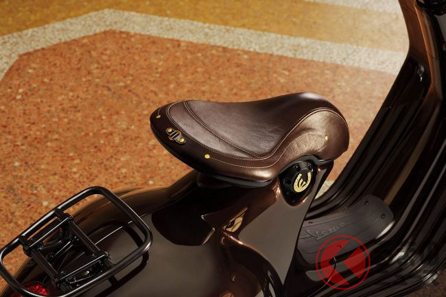 車体には洗練されたゴールドのディテールが巧みに取り入れられており、シート下にはVespaの「V」を囲む金色の蹄鉄をあしらった象徴的なデザインが施されています。また、乗馬用の鞍を思わせる革製のシートに加え、ハンドルバーグリップとミラーステムにも上質なレザーが巻かれるなど、イタリアの卓越した職人技が優雅さと個性を与えています。