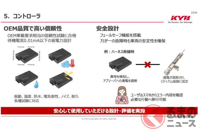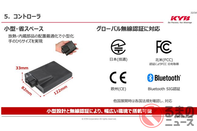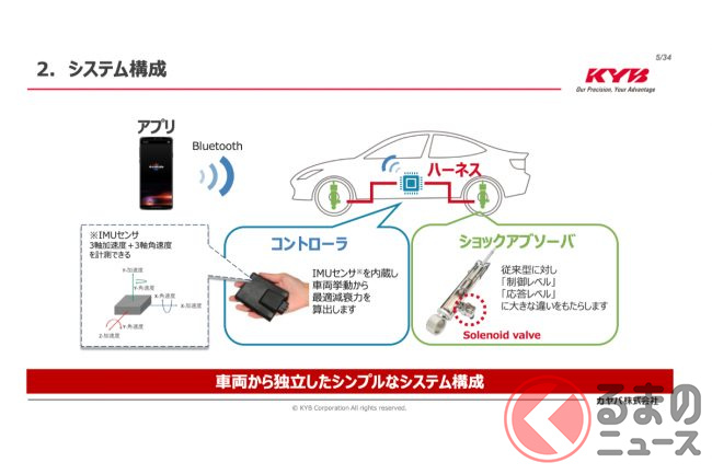 この革新を支えるのは、カヤバが誇る電子制御技術です。システムは、専用アプリ(iOS、アンドロイド対応)、小型で軽量なIMU(慣性計測装置)内蔵のコントローラー、そして「ソレノイド式ショックアブソーバー」の3つの要素で構成されています。
