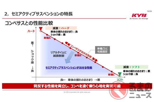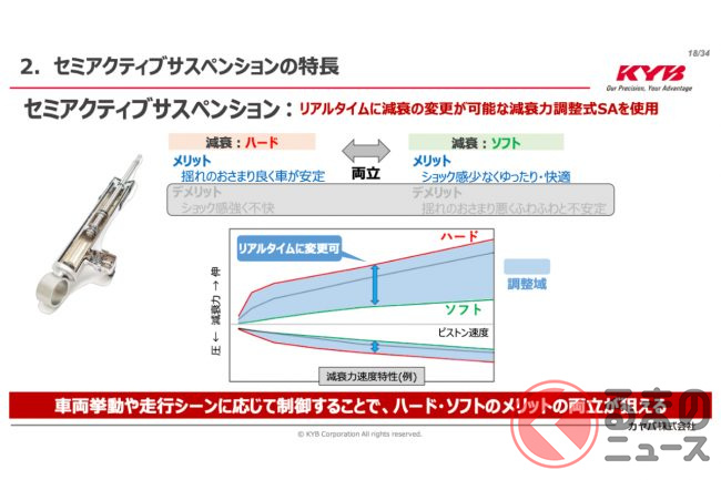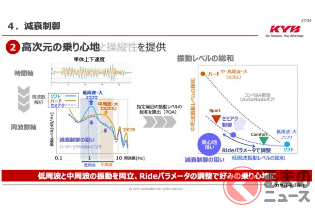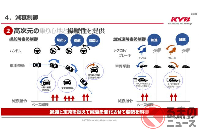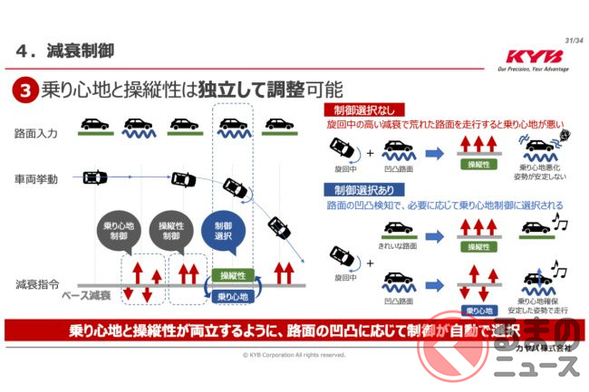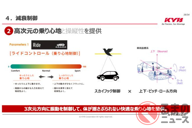また、車体と空中の間に仮想のダンパーを想定する「スカイフック制御」の導入にも注目です。
