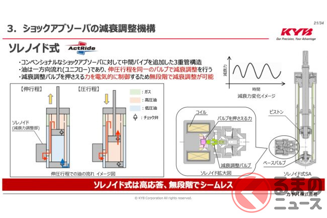 この課題を解決するのが、リアルタイムで減衰力を変化させる「セミアクティブサスペンション」です。ActRideでは、減衰調整機構に「ソレノイド式」を採用しています。